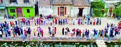 在青田,藝術(shù)讓這個村落慢慢蘇醒,也讓青田人對家鄉(xiāng)充滿驕傲與自豪。除了青田水鄉(xiāng)藝術(shù)季、“上善若水——藝術(shù)龍舟行動”等活動,一場“走田”主題時裝秀,更是點燃了村民的熱情。穿著設計師以鄉(xiāng)村生產(chǎn)生活為靈感設計的服裝,佩戴著自己親手制作的香云紗配飾,道具是平日田間勞作的老物什,村民“模特”們雖面露羞澀,但走在自己最熟悉的鄉(xiāng)野,走出的是自信、堅定的步伐,仿佛在告訴每一個人,這就是我們的生活,我們的時尚。