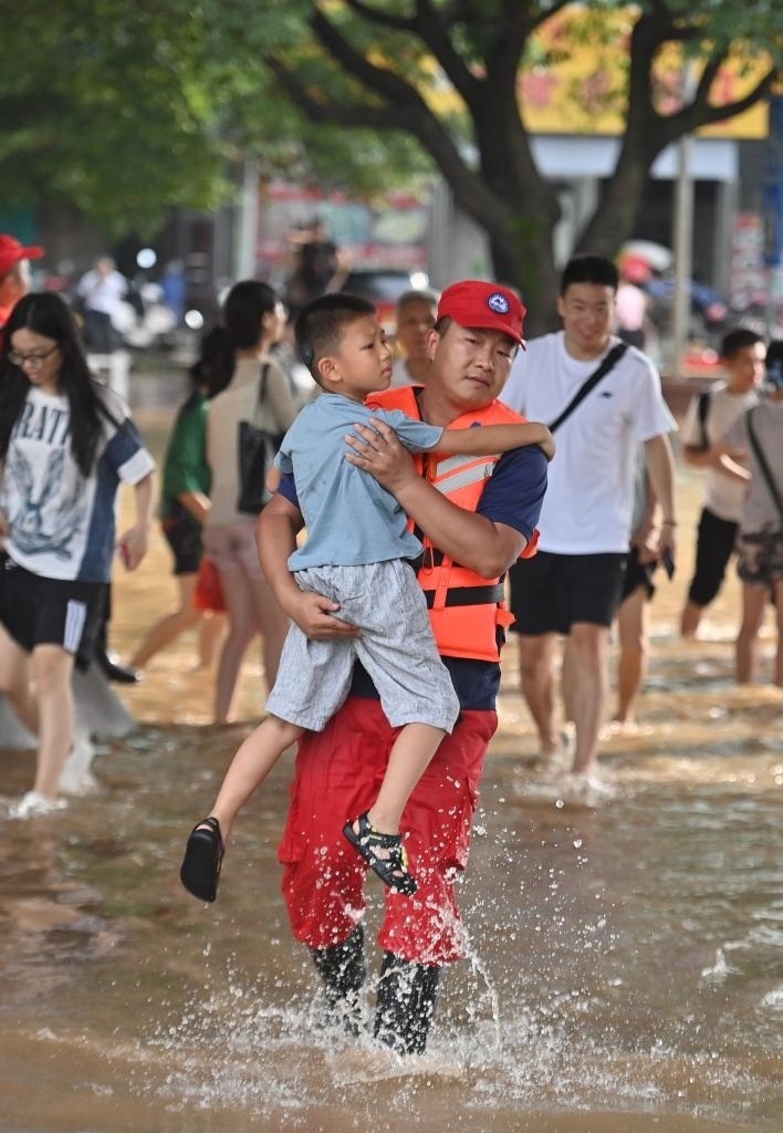 在桂林市上海路,救援人員在轉(zhuǎn)移群眾。新華社記者黃孝邦 攝