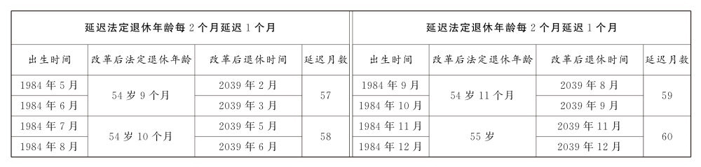 第一條 從2025年1月1日起,男職工和原法定退休年齡為五十五周歲的女職工,法定退休年齡每四個(gè)月延遲一個(gè)月,分別逐步延遲至六十三周歲和五十八周歲;原法定退休年齡為五十周歲的女職工,法定退休年齡每二個(gè)月延遲一個(gè)月,逐步延遲至五十五周歲。國(guó)家另有規(guī)定的,從其規(guī)定。