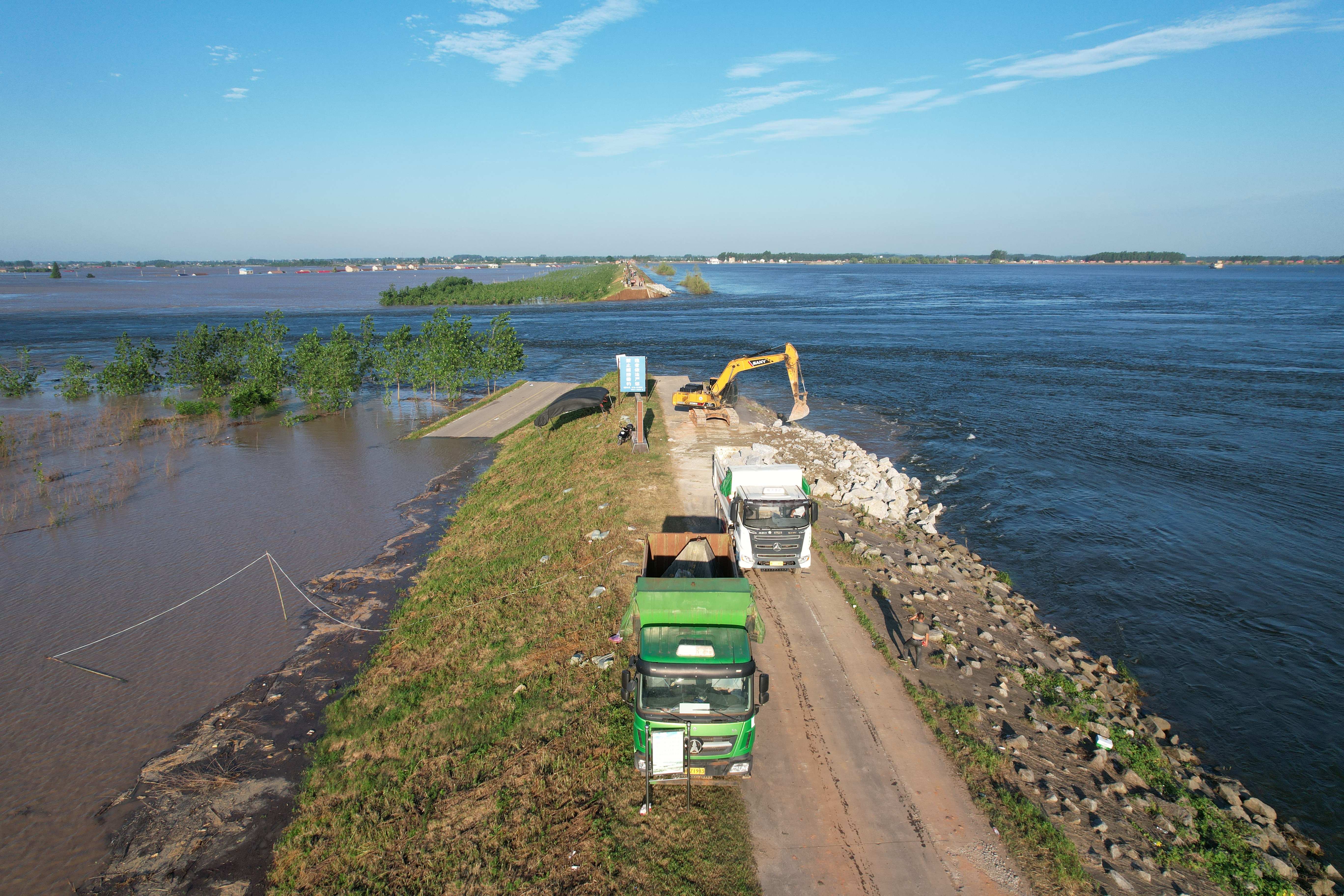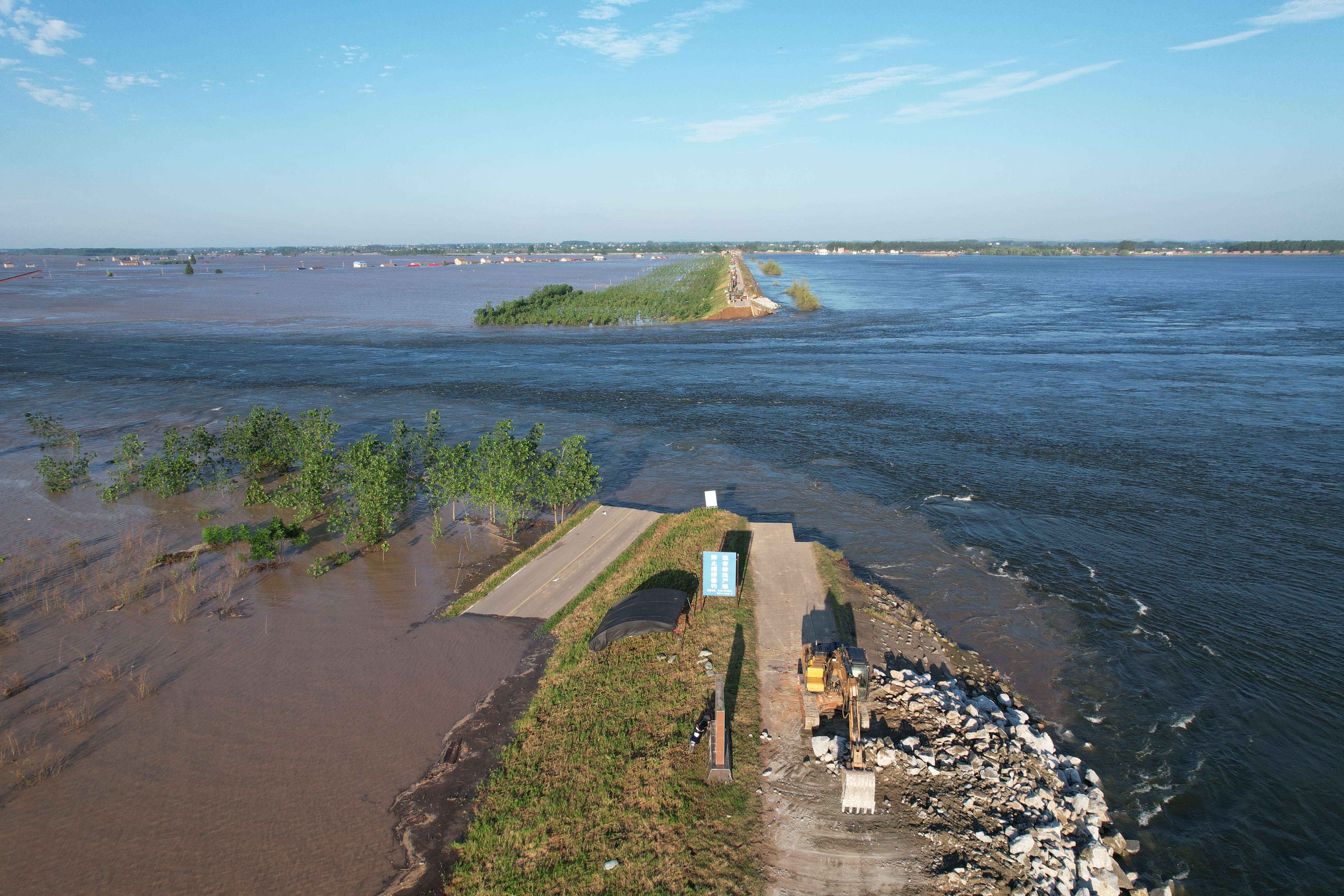 目前,前線正加緊組織工程機(jī)械加緊施工,在決口兩端建設(shè)4個(gè)倒車(chē)平臺(tái),并在決口兩端傾倒大型石塊,建設(shè)‘裹頭’,減緩水流對(duì)決口沖刷,防止決口擴(kuò)大。