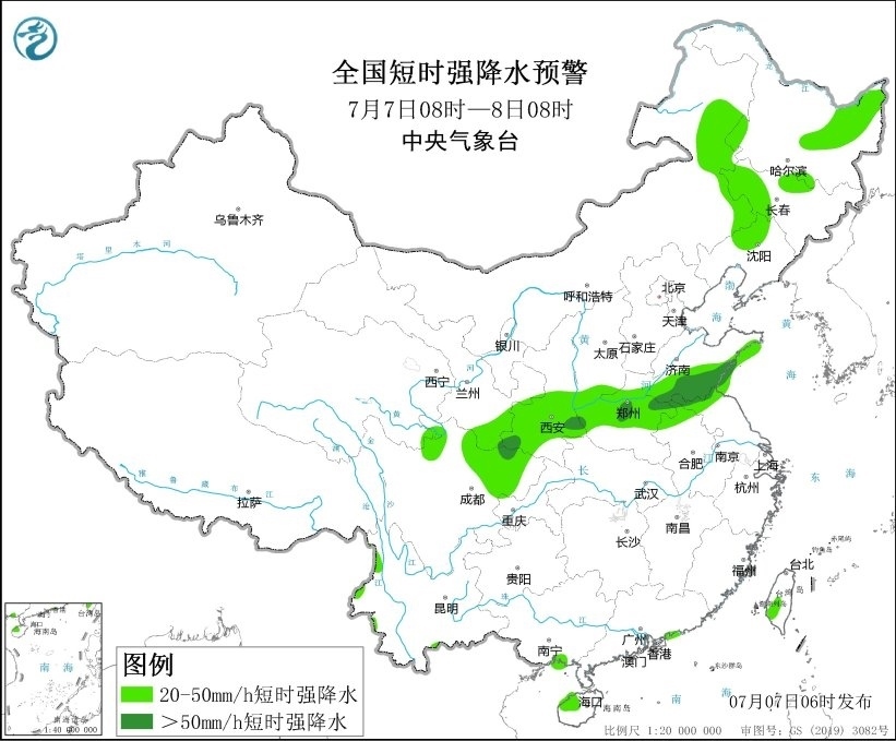 預(yù)計(jì)7月7日08時(shí)至8日08時(shí),內(nèi)蒙古東北部、黑龍江東北部和西南部、吉林北部、青海東南部、甘肅東南部、陜西南部、山西西南部、山東南部、河南中部、安徽北部、江蘇北部、四川北部、重慶西部等地的部分地區(qū)將有8級(jí)以上雷暴大風(fēng)或冰雹天氣,其中,山東南部、河南東部、安徽北部、江蘇北部等地的部分地區(qū)將有10級(jí)以上雷暴大風(fēng),最大風(fēng)力可達(dá)11級(jí)以上;內(nèi)蒙古東部、黑龍江中東部、吉林中西部、遼寧北部、甘肅東南部、陜西中南部、山西南部、山東中南部、河南中北部、安徽北部、江蘇北部、四川北部、海南島西北部、臺(tái)灣島西南部等地的部分地區(qū)將有小時(shí)雨量大于20毫米的短時(shí)強(qiáng)降水天氣,其中,陜西東南部、山東南部、河南中部、江蘇北部、四川盆地西北部等地的部分地區(qū)將有小時(shí)雨量大于50毫米,最大可達(dá)70毫米以上。