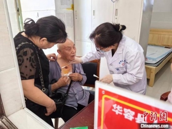 湖南華容縣人民醫(yī)院醫(yī)生正在給剛剛轉(zhuǎn)移到安置點(diǎn)的鮑松柏老人治療。中新網(wǎng)記者 白祖偕 攝
