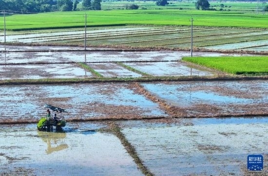 8月3日,衡東縣草市鎮(zhèn)村民駕駛農(nóng)機(jī)開(kāi)展晚稻插秧工作(無(wú)人機(jī)照片)。