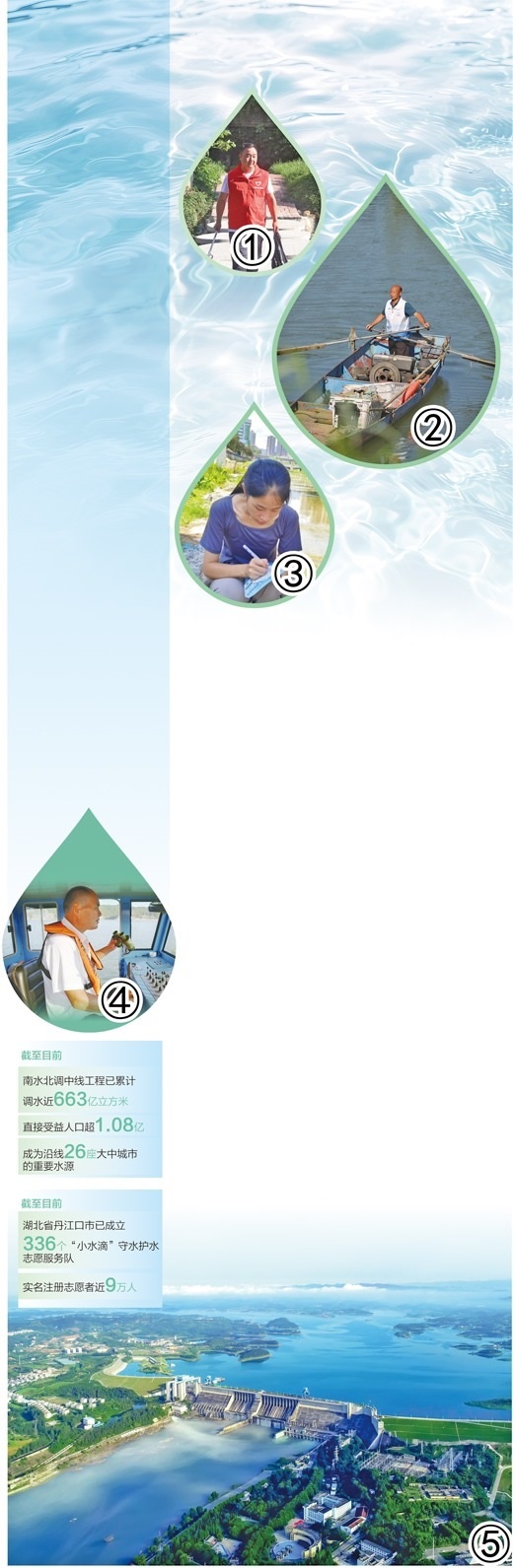 圖①:涂青海在巡線時撿拾垃圾。段 浩攝 圖②:蔣德新在巡護(hù)。丹江口市委宣傳部供圖 圖③:廖思盈在記錄水質(zhì)采樣數(shù)據(jù)。漢江師范學(xué)院供圖 圖④:肖安山在駕駛清漂船。鄖陽區(qū)委宣傳部供圖 圖⑤:丹江口水庫鳥瞰。丹江口市委宣傳部供圖 數(shù)據(jù)來源:中國南水北調(diào)集團(tuán)有限公司、丹江口市委宣傳部