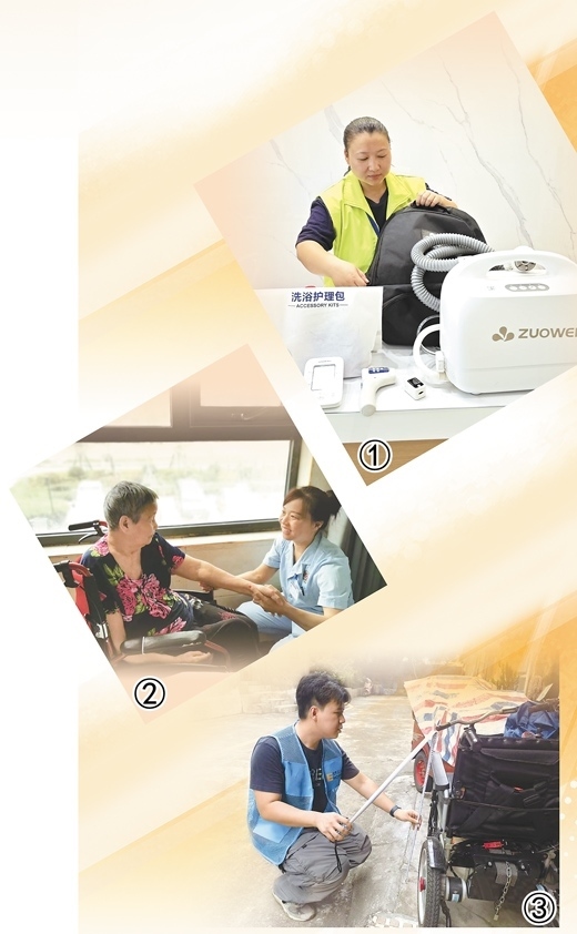 圖①:老年助浴員肖琳在店里收拾設(shè)備,準(zhǔn)備上門為老人助浴。冷智梅攝 圖②:健康照護(hù)師劉馳在為耿守愛老人進(jìn)行護(hù)理。本報記者 朱佩嫻攝 圖③:適老化改造評估師鐘晉軒在測量曾炳成老人的輪椅扶手高度。本報記者 洪秋婷攝