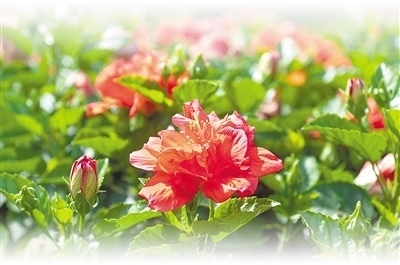 朱槿花大色艷,花蕊細(xì)長(zhǎng)伸出于花瓣之外,花柱五裂,柱頭如粉球,花形俏麗喜慶,在我國(guó)兩廣地區(qū)被稱為“大紅花”,深受人們喜愛。在南寧,常見的朱槿花有十幾個(gè)品種,既有獨(dú)株高兩三米的小喬木、適合密植為樹籬的灌木,也有適合庭院、窗臺(tái)精巧布置的盆栽。