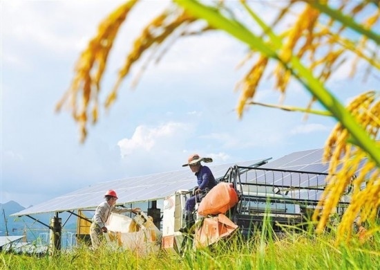 10月10日,湖南省東安縣紫溪市鎮(zhèn)中心村,農(nóng)民在高標(biāo)準(zhǔn)農(nóng)田收獲晚稻。今年前三季度,全國夏糧早稻產(chǎn)量合計17795萬噸,比上年增加346萬噸,增長2.0%。蔡小平攝(中經(jīng)視覺)
