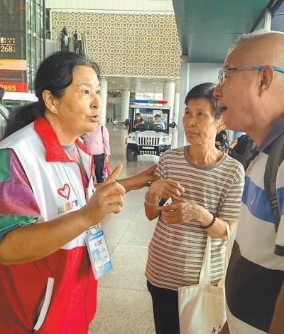 廣州南站的每個(gè)角落唐偉都了然于心。她已經(jīng)在這里服務(wù)超過(guò)13個(gè)年頭,是志愿服務(wù)隊(duì)里年紀(jì)最大的一名“銀發(fā)”志愿者,人們親切地稱呼她為“唐姨”。