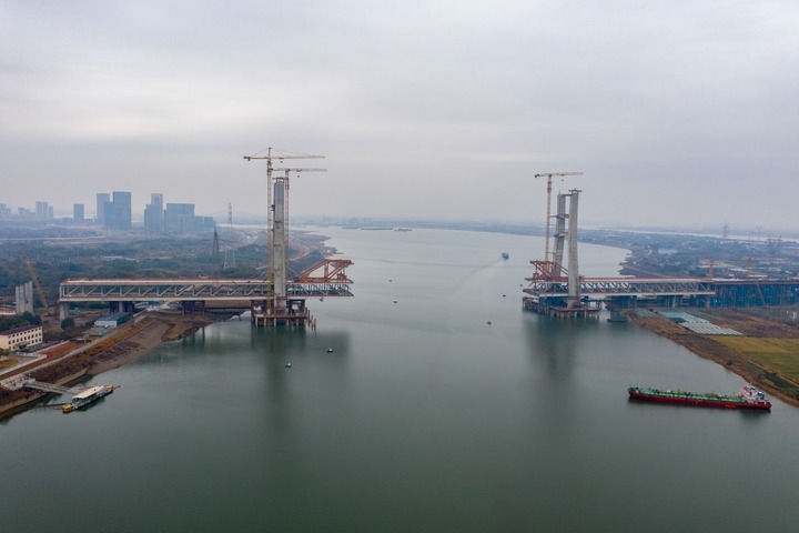 這是1月31日拍攝的昌九高鐵南昌揚子洲贛江公鐵大橋(西支)施工現(xiàn)場(無人機照片)。新華社記者 郭杰文 攝