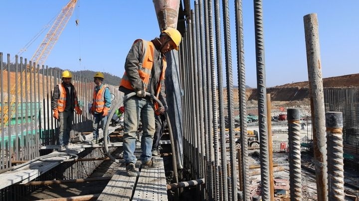1月28日,工人在江西省景德鎮(zhèn)市樂平水利樞紐工程建設現(xiàn)場施工。新華社發(fā)(賀蔚安 攝)