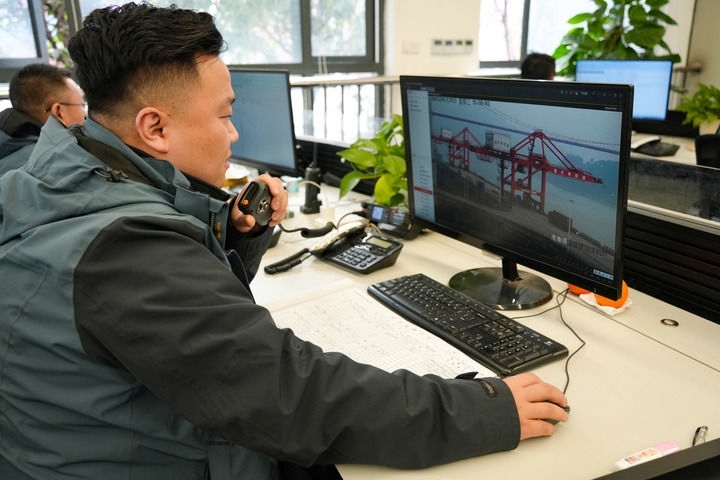 1月29日,調度員耿杰在重慶果園港集裝箱公司生產(chǎn)調度指揮中心內(nèi)值班。新華社記者 田金文 攝