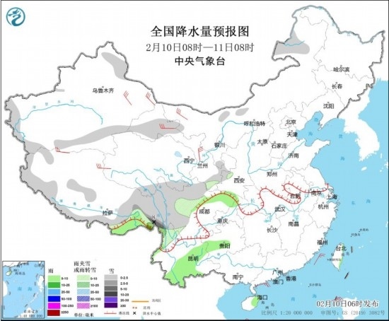 全國降水量預報圖(2月10日08時-11日08時) 圖片來源:中央氣象臺網(wǎng)站