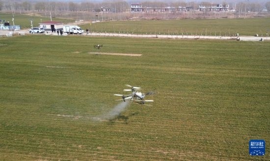2月27日,植保無人機在山東省新泰市禹村鎮(zhèn)作業(yè)(無人機照片)。