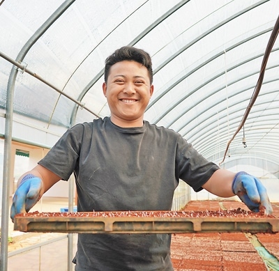種好超級雜交水稻,秧苗質(zhì)量很重要。農(nóng)技人員要提前浸種、曬種,防治多種傳染病害。在基地,農(nóng)戶也早早準(zhǔn)備了育秧材料。倒入基質(zhì)土、送入秧盤、鋪土、澆水、撒種、蓋土……一系列工序后,育秧盤送入暗室催芽,再過兩天,擺進(jìn)溫室大棚。