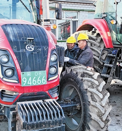 農(nóng)機(jī)庫里,社員程傳寶蹲在拖拉機(jī)旁仔細(xì)檢查,反復(fù)確認(rèn)有沒有漏油,或者零件松動。