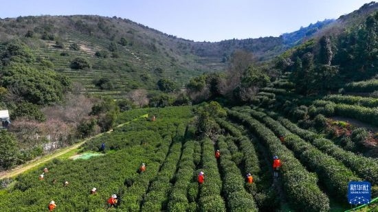 3月17日,在蘇州市吳中區(qū)西山國(guó)家現(xiàn)代農(nóng)業(yè)示范園金海華碧水緣茶葉基地,采茶工在碧螺春古茶園采茶(無(wú)人機(jī)照片)。