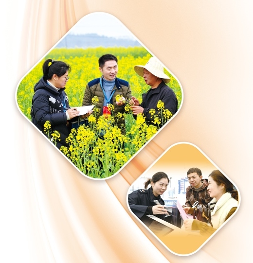 上圖:江西省上高縣錦江鎮(zhèn)團結村油菜花種植基地中,黨員干部(左、中)正在了解春耕情況。