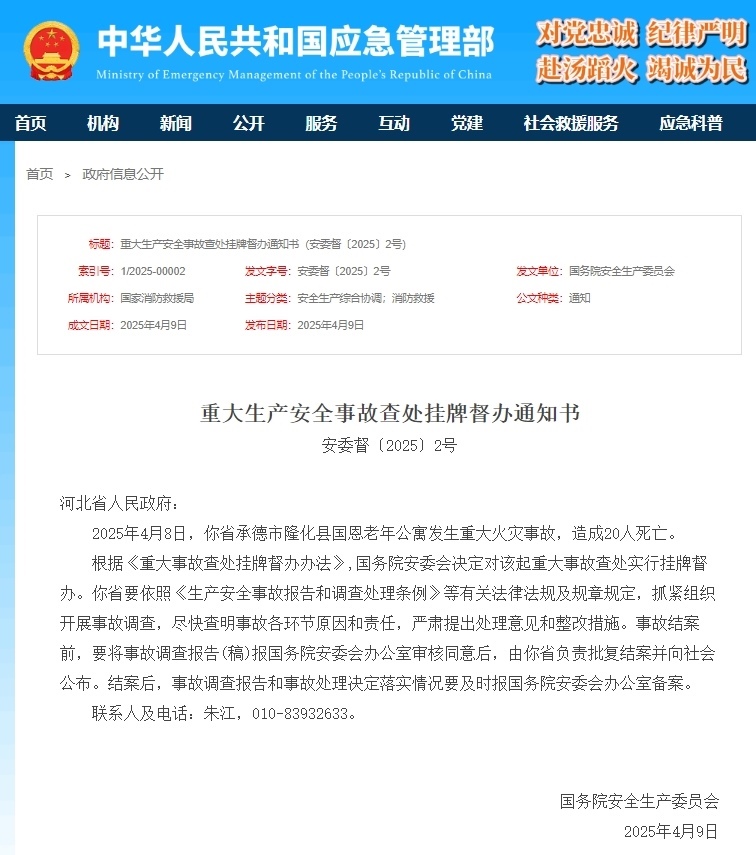 人民網(wǎng)北京4月9日電 (記者溫璐、郝萍)據(jù)應(yīng)急管理部消息,4月9日,國務(wù)院安全生產(chǎn)委員會發(fā)布向河北省人民政府發(fā)布重大生產(chǎn)安全事故查處掛牌督辦通知書。通知書稱,2025年4月8日,河北省承德市隆化縣國恩老年公寓發(fā)生重大火災(zāi)事故,造成20人死亡。根據(jù)《重大事故查處掛牌督辦辦法》,國務(wù)院安委會決定對該起重大事故查處實行掛牌督辦。河北省要依照《生產(chǎn)安全事故報告和調(diào)查處理條例》等有關(guān)法律法規(guī)及規(guī)章規(guī)定,抓緊組織開展事故調(diào)查,盡快查明事故各環(huán)節(jié)原因和責(zé)任,嚴(yán)肅提出處理意見和整改措施。事故結(jié)案前,要將事故調(diào)查報告(稿)報國務(wù)院安委會辦公室審核同意后,由河北省負(fù)責(zé)批復(fù)結(jié)案并向社會公布。結(jié)案后,事故調(diào)查報告和事故處理決定落實情況要及時報國務(wù)院安委會辦公室備案。