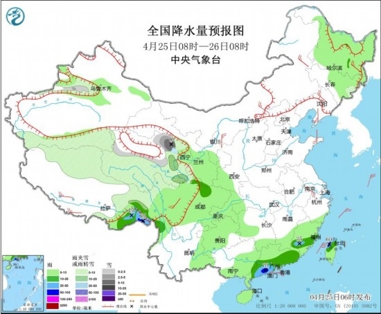 4月25日08時至26日08時,新疆沿天山地區(qū)和南疆南部、西藏北部和東部、青海大部、甘肅南部、川西高原北部等地部分地區(qū)有小到中雪或雨夾雪,局地有大雪(5~8毫米)。西藏東南部、四川盆地西北部、云南西北部、福建中南部、廣東南部、臺灣島北部等地部分地區(qū)有中到大雨,其中,西藏東南部、廣東西南部、臺灣島西北部等地部分地區(qū)有暴雨(50~75毫米)。內(nèi)蒙古中東部、黑龍江東部、遼寧大部、江蘇南部、西藏南部、川西高原北部等地部分地區(qū)有4~5級風;東海大部海域、臺灣海峽有5~7級風,陣風8級。