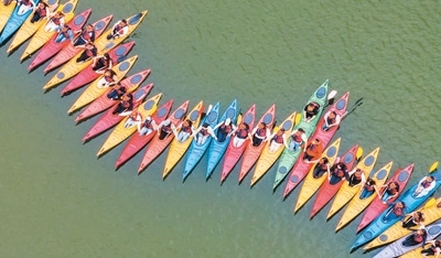 4月25日,重慶市南川區(qū)黎香湖鎮(zhèn)黎香湖皮劃艇基地,游客們在湖里體驗水上運動樂趣。據(jù)介紹,“五一”假期期間該皮劃艇基地已預(yù)約滿員。