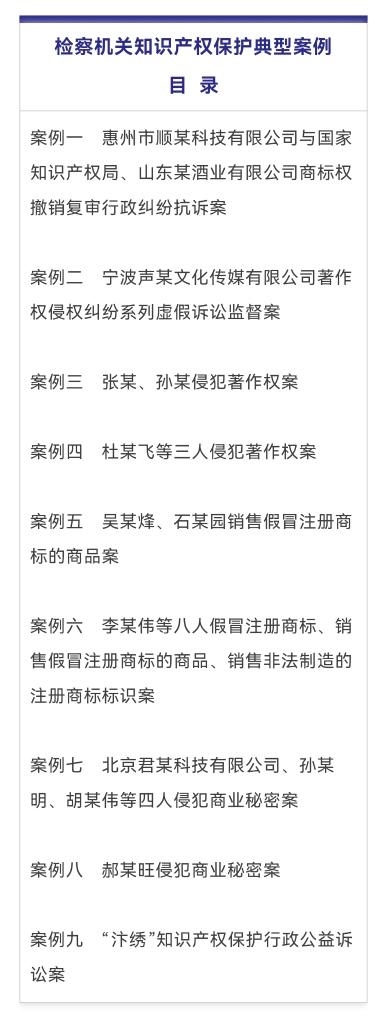 最高人民檢察院日前發(fā)布9件檢察機(jī)關(guān)知識產(chǎn)權(quán)保護(hù)典型案例,展現(xiàn)知識產(chǎn)權(quán)檢察綜合履職的工作成效。