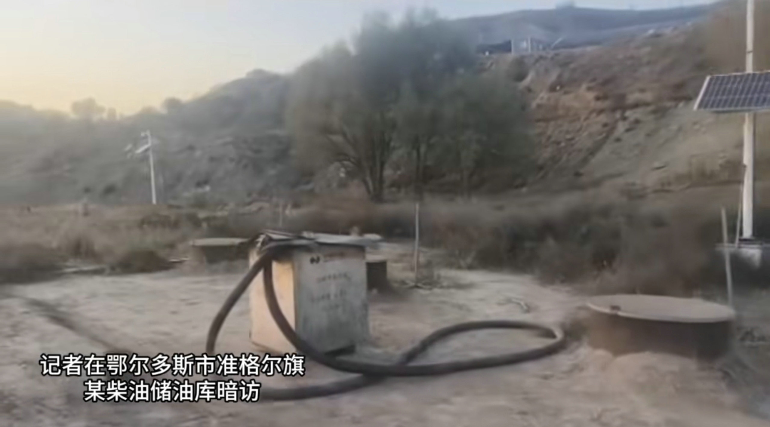 10月28日,內(nèi)蒙古日?qǐng)?bào)社張弓長(zhǎng)新聞工作室記者在鄂爾多斯市準(zhǔn)格爾旗一個(gè)緊鄰礦區(qū)的山溝里暗訪時(shí)發(fā)現(xiàn),有一處規(guī)模較大的地埋罐式柴油儲(chǔ)油庫(kù),存在重大安全隱患。