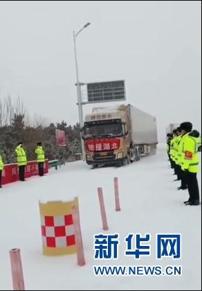 2月14日,內(nèi)蒙古多地普降大雪,從赤峰出發(fā)的運輸車輛,在當(dāng)?shù)亟痪淖o送下順利踏上征途。沿途的交警列隊敬禮,目送車隊離去。