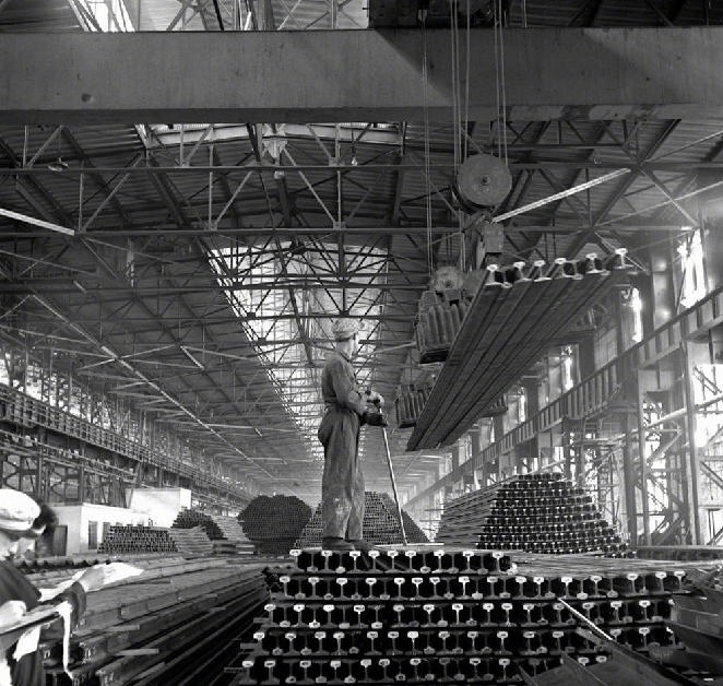 “一五”期間,鞍鋼興建的第一座大型軋鋼廠(chǎng)生產(chǎn)能力已迅速超過(guò)設(shè)計(jì)標(biāo)準(zhǔn)。這是這個(gè)廠(chǎng)生產(chǎn)的大批鋼軌(攝于1957年4月)。