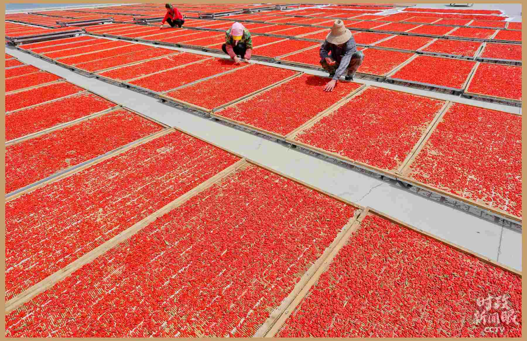 △甘肅張掖苗家堡村“扶貧車間”里,農(nóng)戶在晾曬枸杞。