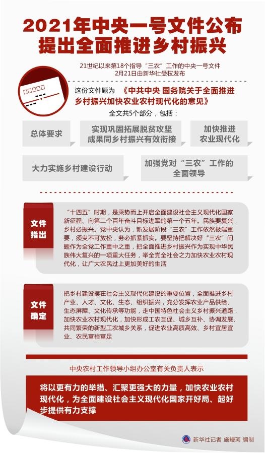 文件指出,“十四五”時期,是乘勢而上開啟全面建設(shè)社會主義現(xiàn)代化國家新征程、向第二個百年奮斗目標(biāo)進(jìn)軍的第一個五年。民族要復(fù)興,鄉(xiāng)村必振興。黨中央認(rèn)為,新發(fā)展階段“三農(nóng)”工作依然極端重要,須臾不可放松,務(wù)必抓緊抓實。要堅持把解決好“三農(nóng)”問題作為全黨工作重中之重,把全面推進(jìn)鄉(xiāng)村振興作為實現(xiàn)中華民族偉大復(fù)興的一項重大任務(wù),舉全黨全社會之力加快農(nóng)業(yè)農(nóng)村現(xiàn)代化,讓廣大農(nóng)民過上更加美好的生活。