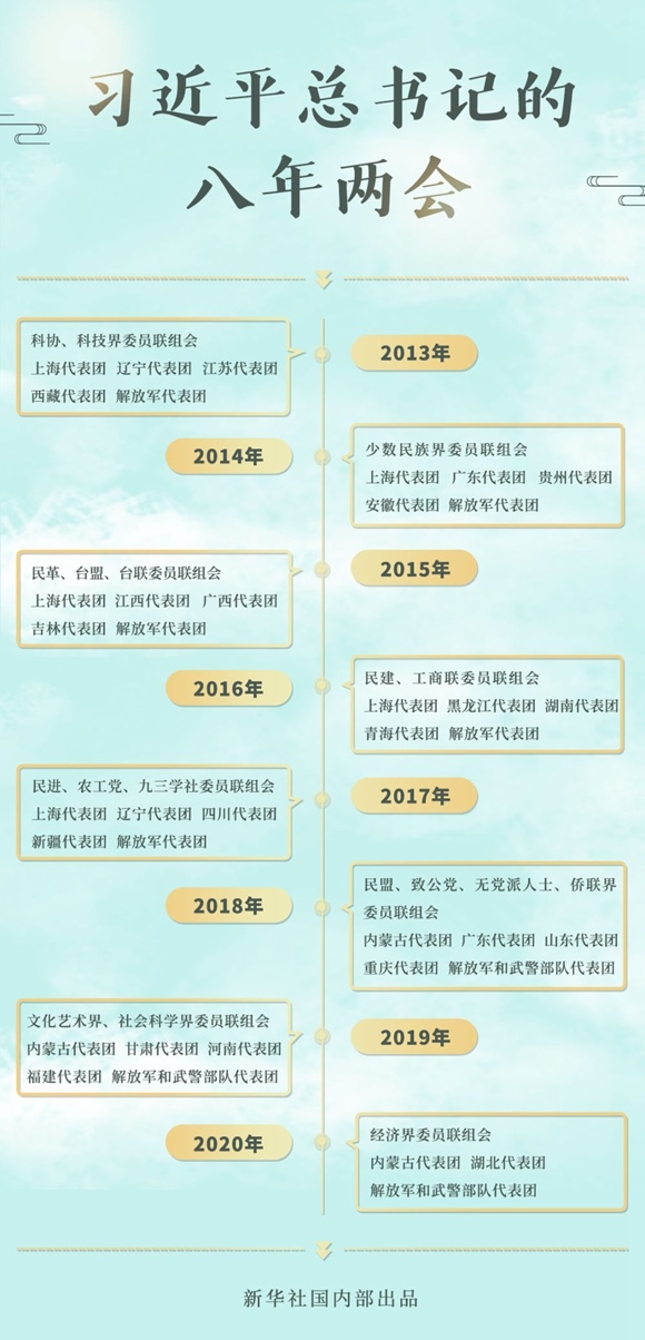 2013-2020,八年的全國(guó)兩會(huì)上,總書(shū)記46次到團(tuán)組參加審議討論。交流之中,語(yǔ)重心長(zhǎng);言談之間,發(fā)人深思。