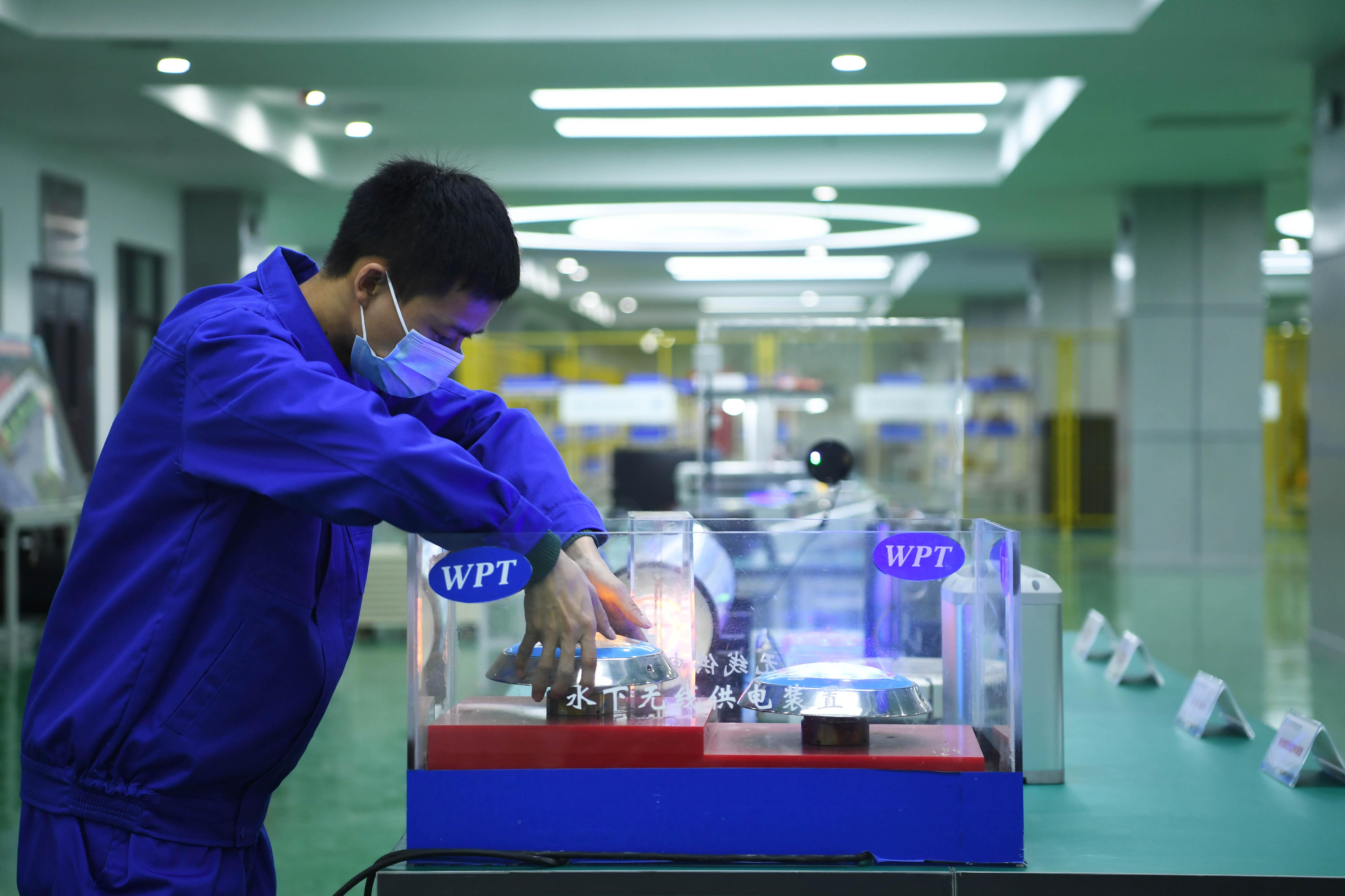 △重慶一科技企業(yè)的工作人員正在測試水下無線供電裝置。