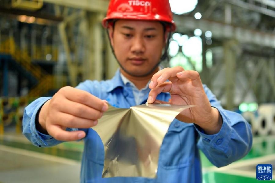 在位于山西的太鋼集團(tuán),員工展示用手撕開0.02毫米厚的超薄帶狀不銹鋼(2019年5月24日攝)。新華社記者 曹陽 攝