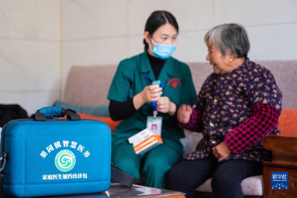 11月12日,在湖南省長沙市長沙縣果園鎮(zhèn)楊泗廟社區(qū),醫(yī)務人員劉敏指導居家老人用藥。新華社記者陳思汗攝