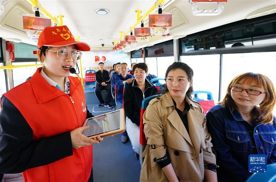 河北省唐山市海港經(jīng)濟開發(fā)區(qū)志愿者宣講員在紅色主題公交車上給乘客講革命故事(5月10日攝)。新華社記者楊世堯攝