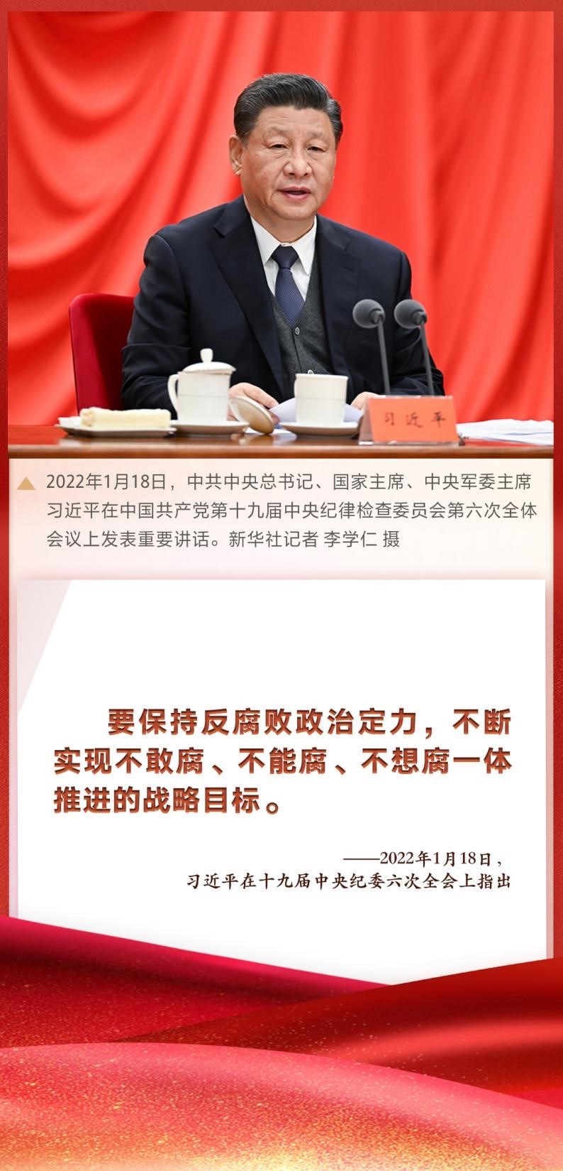 “要保持反腐敗政治定力,不斷實(shí)現(xiàn)不敢腐、不能腐、不想腐一體推進(jìn)的戰(zhàn)略目標(biāo)?!敝泄仓醒肟倳?、國家主席、中央軍委主席習(xí)近平在十九屆中央紀(jì)委六次全會(huì)上發(fā)表重要講話,深刻總結(jié)新時(shí)代黨的自我革命的成功實(shí)踐,深刻闡述全面從嚴(yán)治黨取得的歷史性、開創(chuàng)性成就,產(chǎn)生的全方位、深層次影響,對(duì)堅(jiān)持不懈把全面從嚴(yán)治黨向縱深推進(jìn)、迎接黨的二十大勝利召開作出戰(zhàn)略部署。