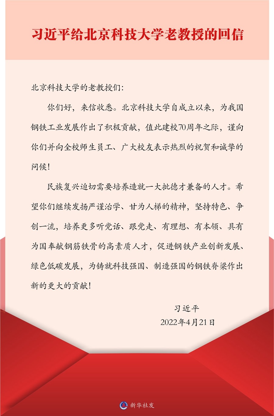 中共中央總書記、國家主席、中央軍委主席習(xí)近平4月21日給北京科技大學(xué)的老教授回信,對(duì)培養(yǎng)更多高素質(zhì)人才,促進(jìn)鋼鐵產(chǎn)業(yè)創(chuàng)新發(fā)展、綠色低碳發(fā)展提出殷切期望。