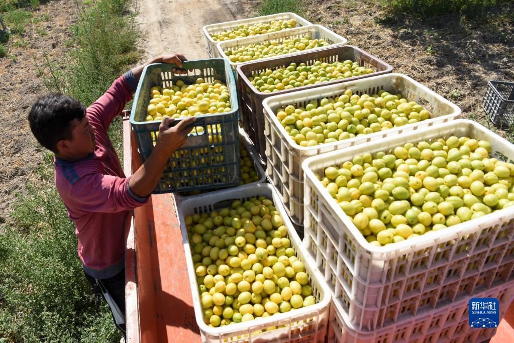 在新疆阿克蘇地區(qū)庫(kù)車(chē)市齊滿鎮(zhèn)齊滿村,農(nóng)戶將采摘的小白杏裝車(chē)(2021年7月1日攝)。新華社記者 丁磊 攝