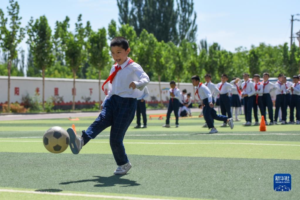 在新疆喀什地區(qū)疏附縣托克扎克鎮(zhèn)中心小學(xué),學(xué)生們?cè)谏象w育課(2022年6月10日攝)。新華社記者 丁磊 攝