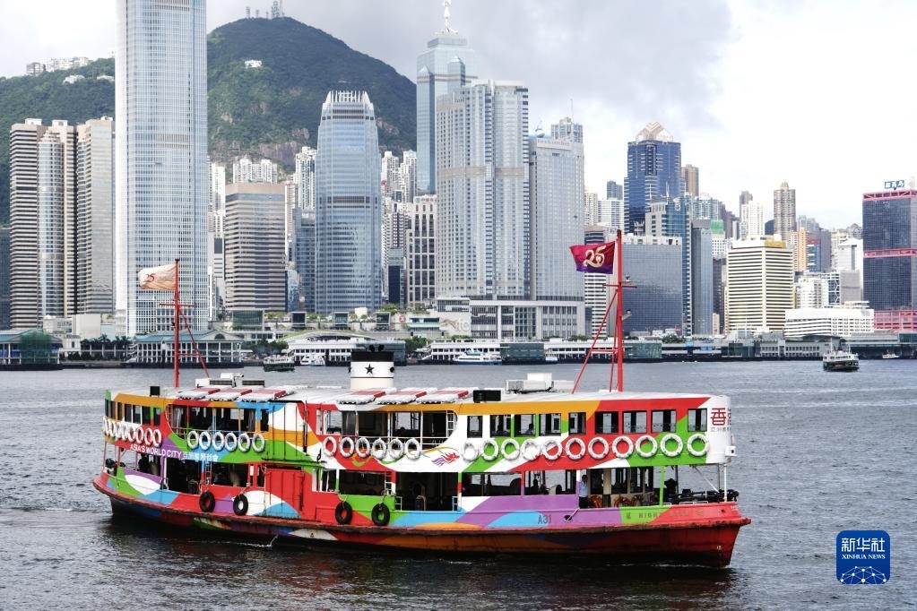 在香港尖沙咀天星碼頭,天星小輪載著慶祝香港回歸祖國25周年標(biāo)志的旗幟在維港航行(2022年6月22日攝)。新華社記者 王申 攝