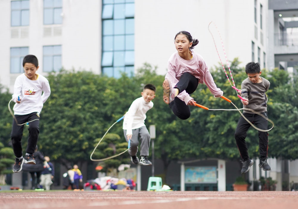 重慶市九龍坡區(qū)西彭鎮(zhèn)第一小學(xué)校學(xué)生在體育課上進行花樣跳繩訓(xùn)練(2020年12月9日攝)。