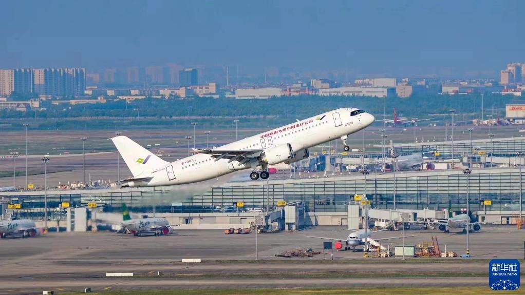 2022年5月14日6時(shí)52分,編號為B-001J的C919大飛機(jī)從上海浦東機(jī)場第4跑道起飛,于9時(shí)54分安全降落,標(biāo)志著中國商飛公司即將交付首家用戶的首架C919大飛機(jī)首次飛行試驗(yàn)圓滿完成。新華社發(fā)