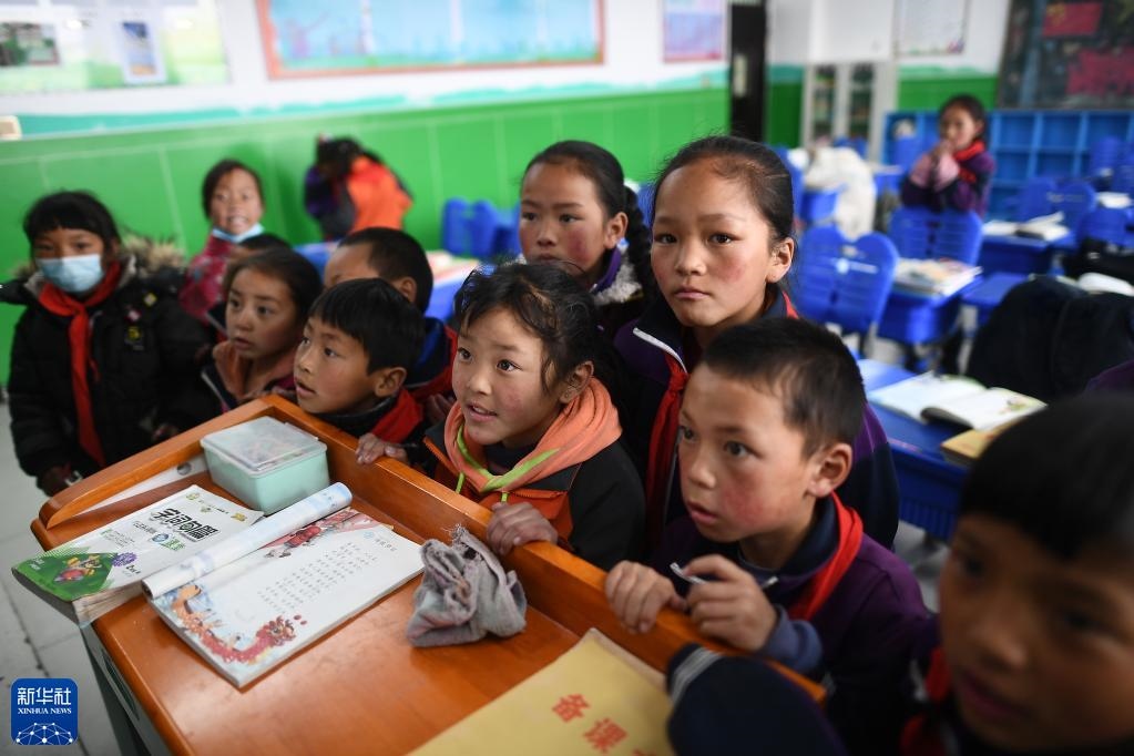 青海省果洛藏族自治州瑪多縣民族寄宿制中學二年級的學生在課間觀看多媒體課件(2021年3月26日攝)。該校采用清潔取暖方式后,學生的學習和生活環(huán)境大為改善。新華社記者 張宏祥 攝
