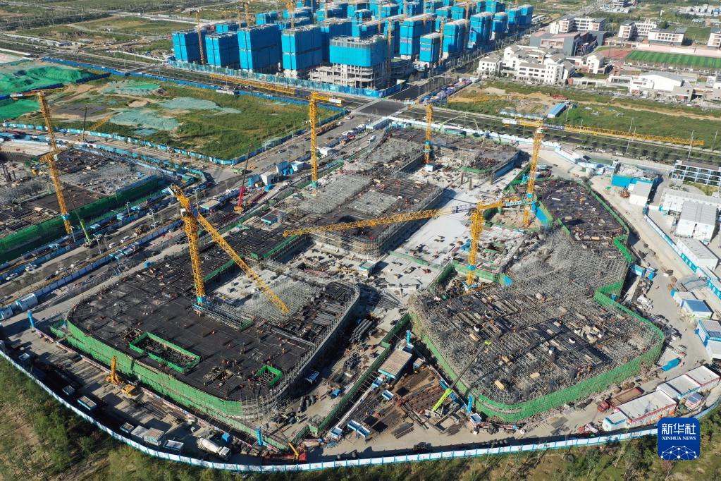 位于雄安新區(qū)啟動區(qū)的中國星網(wǎng)雄安新區(qū)總部大樓建設(shè)施工現(xiàn)場(2022年9月7日攝,無人機(jī)照片)。新華社記者 朱旭東 攝