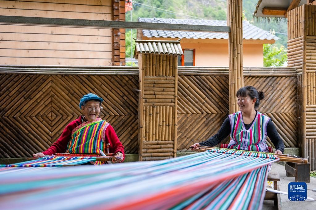 在云南省貢山獨(dú)龍族怒族自治縣獨(dú)龍江鄉(xiāng)迪政當(dāng)村,獨(dú)龍族老人李文仕(左)和女兒在編織獨(dú)龍?zhí)海?022年5月10日攝)。新華社記者 曹夢瑤 攝