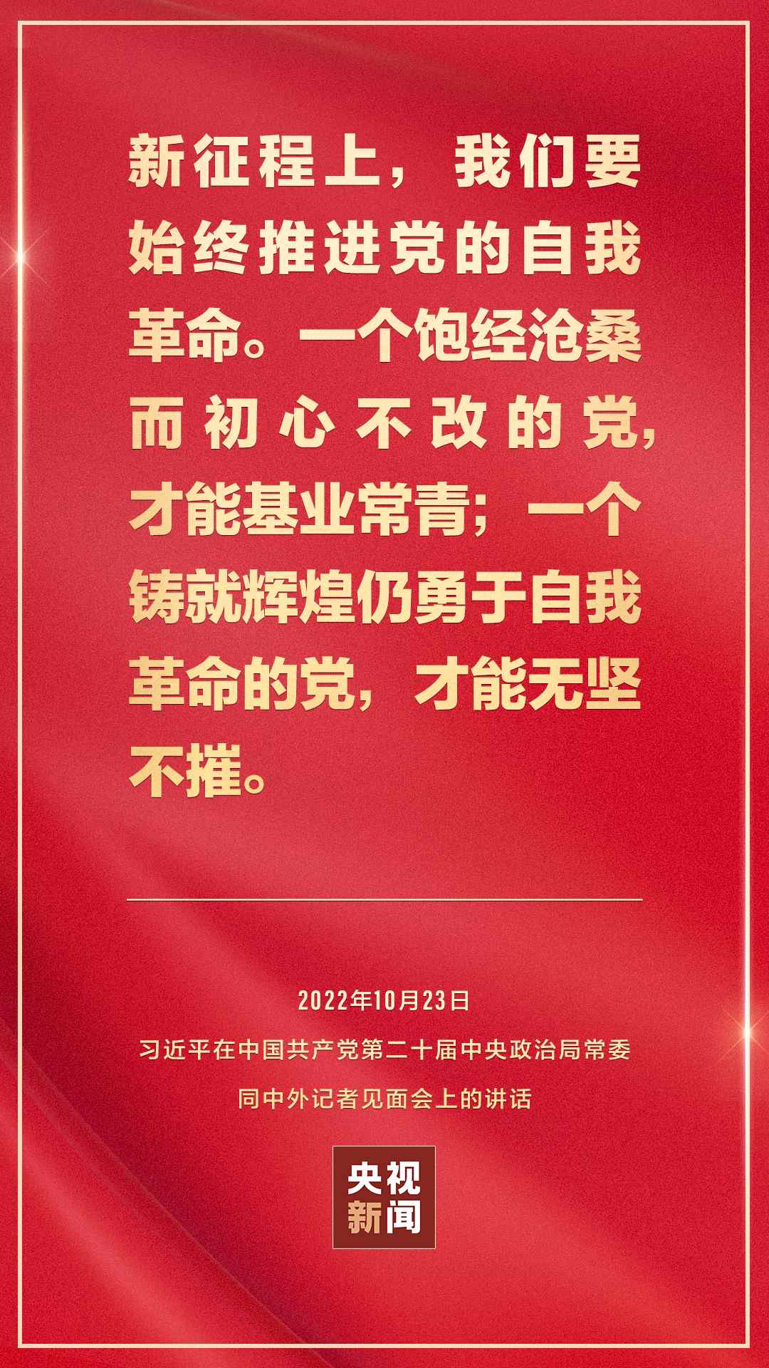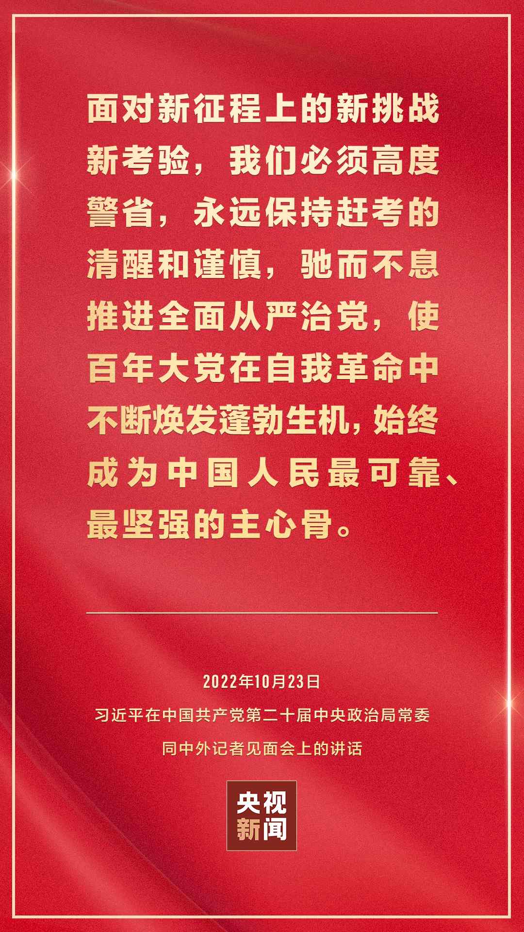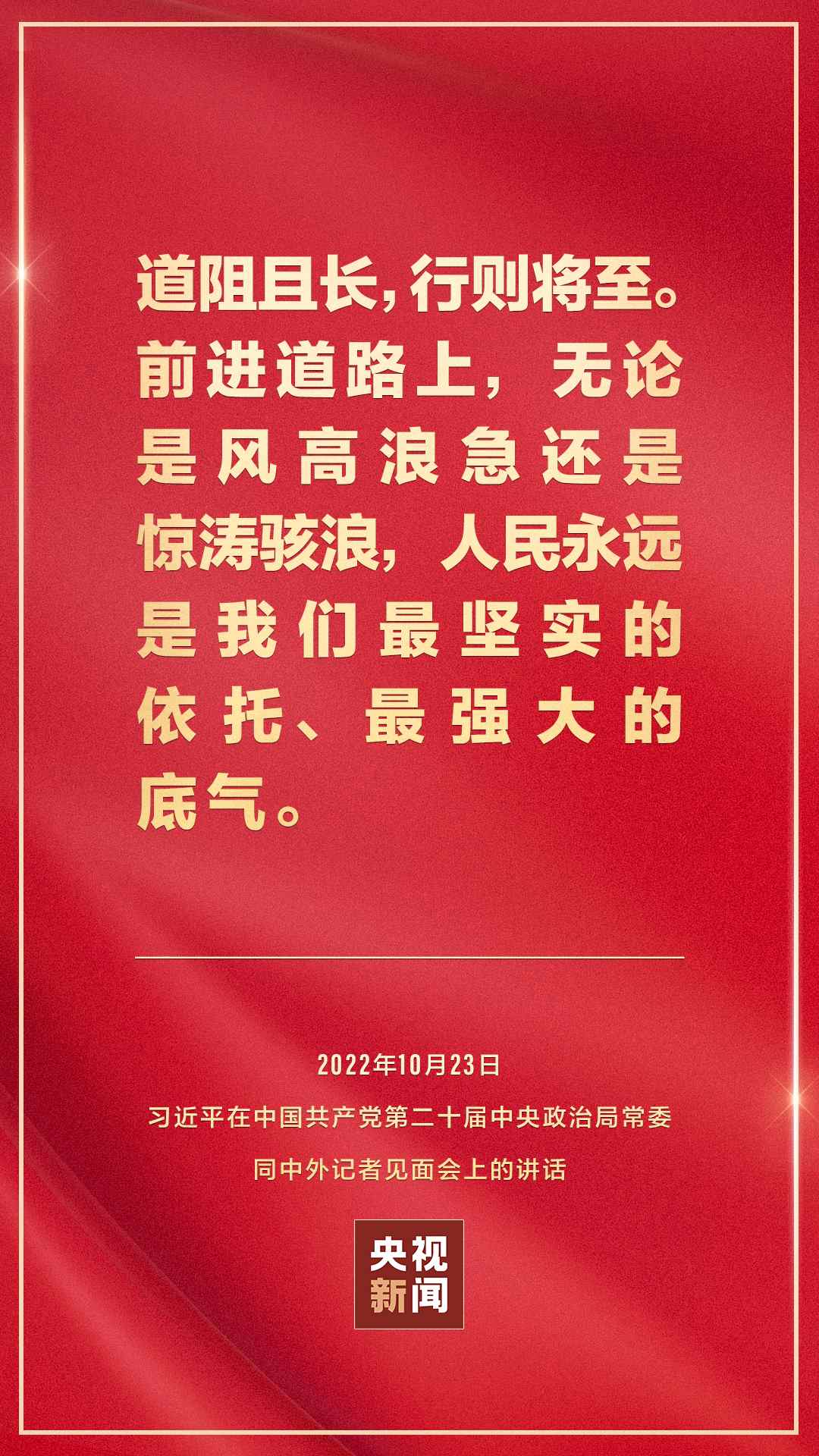 在中國共產黨第二十屆中央委員會第一次全體會議上當選的中共中央總書記習近平和中共中央政治局常委李強、趙樂際、王滬寧、蔡奇、丁薛祥、李希,23日中午在人民大會堂同采訪中共二十大的中外記者見面。習近平發(fā)表重要講話。