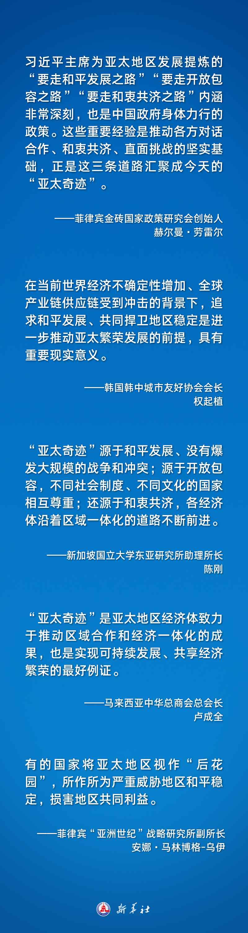 習近平主席的系列重要講話在國際社會引發(fā)熱烈反響。多國人士認為,習近平主席全面總結了“亞太奇跡”的經驗與啟示,就攜手構建亞太命運共同體提出重要主張,深刻闡釋了中國式現(xiàn)代化的機遇與貢獻,為再創(chuàng)亞太合作新輝煌注入強勁動力。