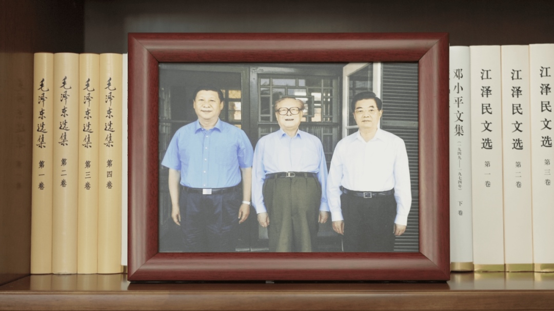 書架上擺放著一張合影。這是1999年9月30日,江澤民同志、朱镕基同志、習(xí)仲勛同志在慶祝建國五十周年招待會上。這張照片第一次出現(xiàn)在習(xí)近平總書記的書架上。