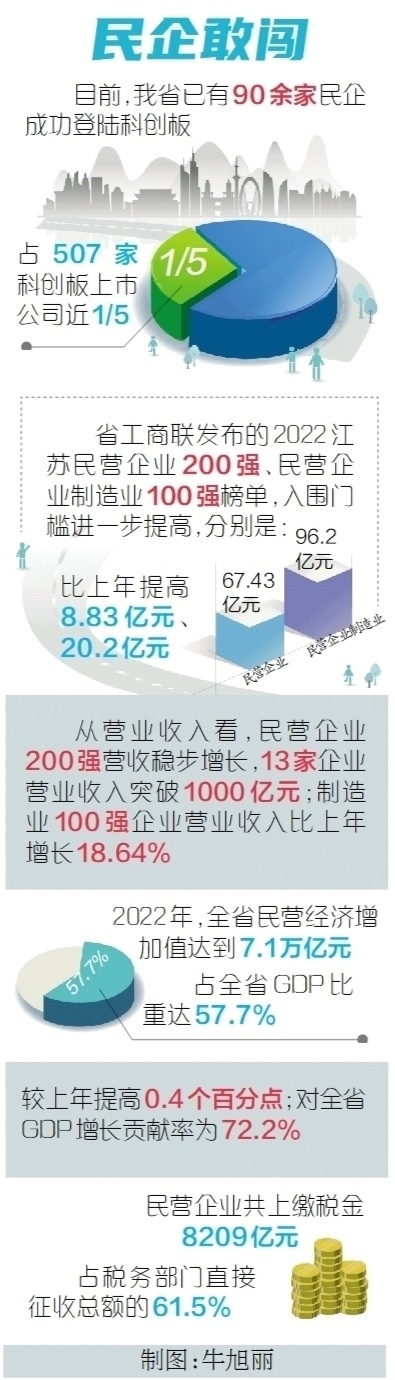 勇立實業(yè)潮頭,爭當(dāng)奮楫搏浪的“水手”,另一份榜單同樣能佐證江蘇民企的勇毅前行。去年9月,省工商聯(lián)發(fā)布2022江蘇民營企業(yè)200強、民營企業(yè)制造業(yè)100強榜單,入圍門檻進(jìn)一步提高,分別達(dá)67.43億元、96.2億元,比上年提高8.83億元、20.2億元。從營業(yè)收入看,民營企業(yè)200強營收穩(wěn)步增長,13家企業(yè)營業(yè)收入突破1000億元;制造業(yè)100強企業(yè)營業(yè)收入比上年增長18.64%。