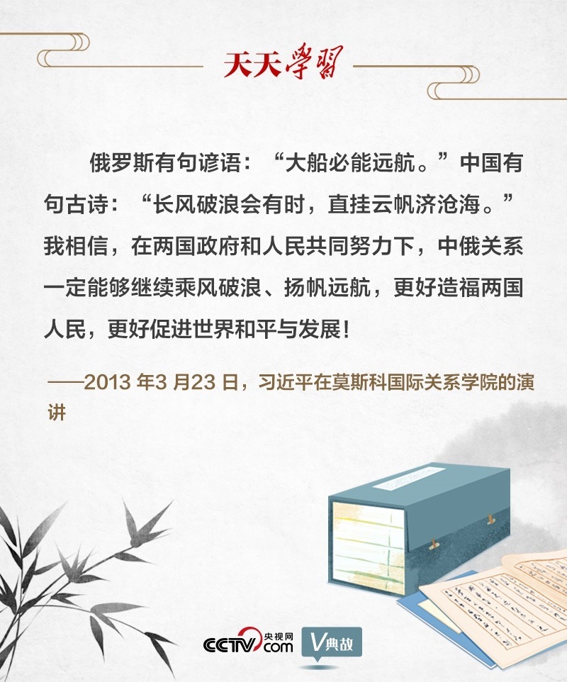 關(guān)于中俄關(guān)系,早在10年前在莫斯科國(guó)際關(guān)系學(xué)院的演講中,習(xí)近平主席就有精辟闡述。演講結(jié)束語中,習(xí)主席首先引用一句俄羅斯諺語“大船必能遠(yuǎn)航”,拉近了與俄羅斯民眾的文化空間和心理距離。接著引用了含義相近的中國(guó)古詩“長(zhǎng)風(fēng)破浪會(huì)有時(shí),直掛云帆濟(jì)滄?!?,讓對(duì)方在文化相似性中深刻領(lǐng)悟其中道理。最后凝聚共同理念:“中俄關(guān)系一定能夠繼續(xù)乘風(fēng)破浪、揚(yáng)帆遠(yuǎn)航”。
